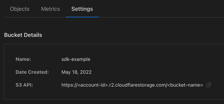 Let's add the CORS configuration to the bucket and give it another try - whilst there's functions in most of the S3 SDKs to do this, we'll just do it ourselves with the API. The URL you're going to be sending my requests to is https://<BUCKET-NAME>.<ACCOUNT-ID>.r2.cloudflarestorage.com/?cors - you can also find this in the overview for that bucket in the Cloudflare dashboard.